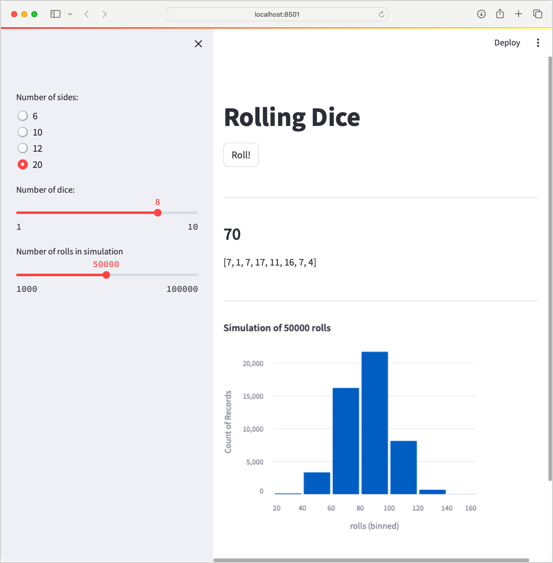 For the output, we use the fact that Streamlit presents string values as markdown by default to place a divider between the input section of the dashboard, and the summary. We use the st.subheader() function to make the most important piece of information stand out, and we print a string representation of the full list of rolls: