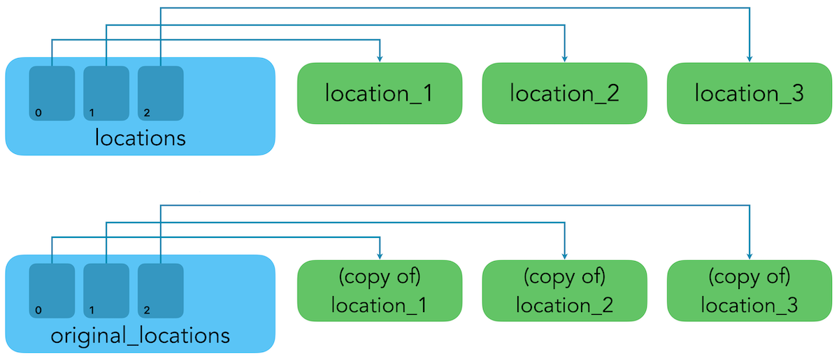 list_name[:] or list_name.copy(), complex objects inside the list are not copied. Instead, the new list gets a reference to the same objects that the original list refers to.When any one of the individual location objects changes, the corresponding item in the list “changes” as well, because that item is really just a reference back to the individual location object.